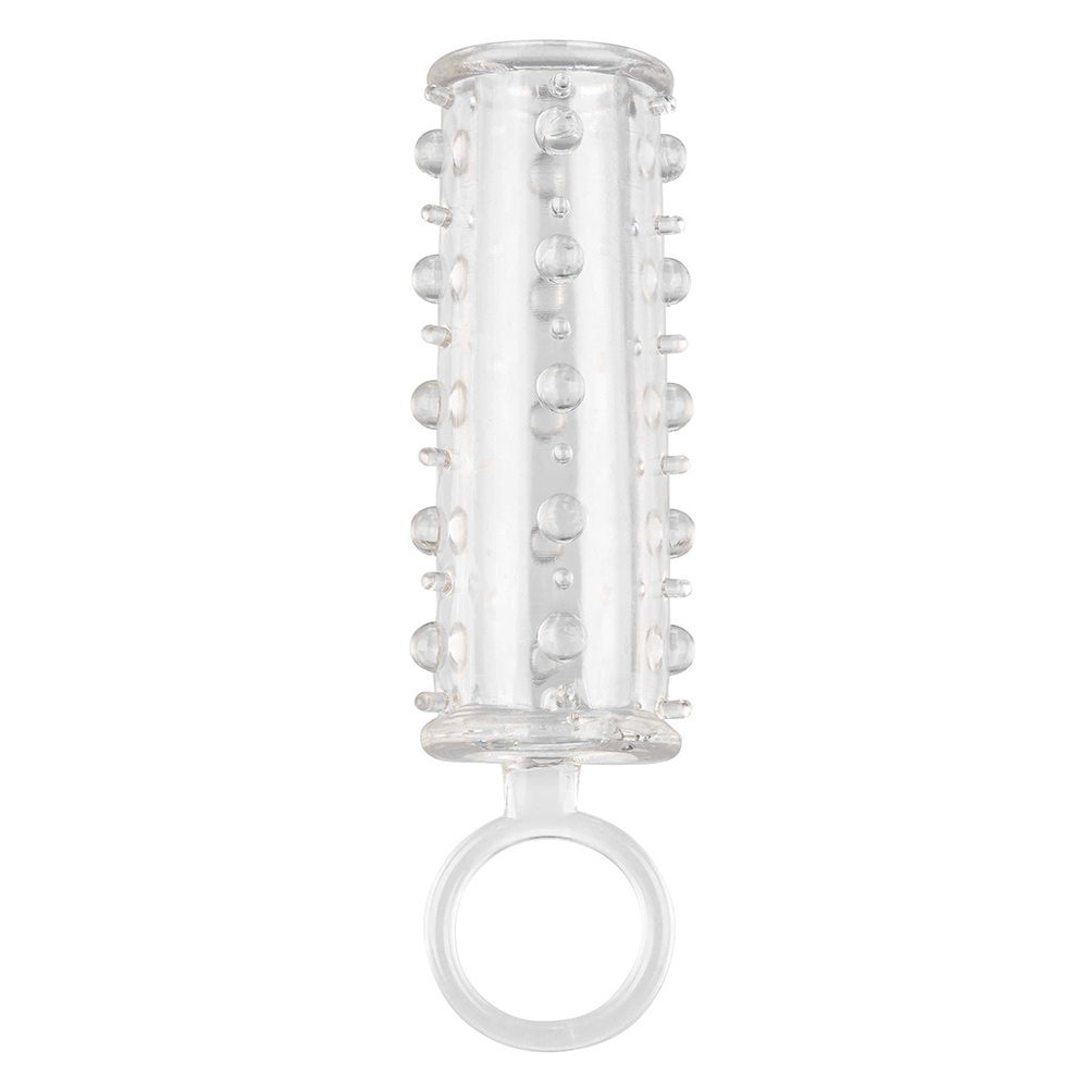 The Sensation Enhancer is a super tight, open-end extension sleeve with a sensually beaded shaft. The super-sized enhancer wraps tight around your pleasure tool to increase girth, length and pleasure. While you thrill your lover with increased girth and stimulating beads, the fulfilling enhancer’s powerful erection support and open-end design results in explosive results for both of you. The erotic enhancer sleeve’s ultra-stretchy material and the spacious chamber is made to fit even the biggest man. The textured chamber and built-in scrotum strap provide increase stimulation and powerful support. Wrap your pleasure tool in this super stretchy sleeve to easily increase stamina, stimulation and orgasmic pleasure. The flexible enhancer is made from a hygienically superior TPE. This body-safe material is unscented and phthalate free to keep your most sensitive spots happy and healthy.