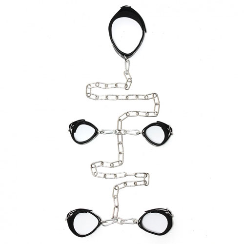 Genuine leather neck to arm to ankle cuff combination with chain, adjustable with buckles.