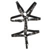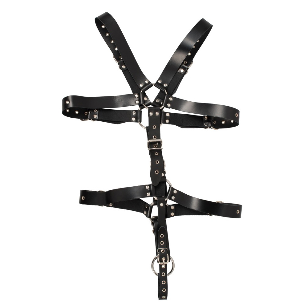 The ultimate harness for leather lovers!Strap body made from black studded leather belts and steel connection rings. Individual fit thanks to multiple adjustable buckle fasteners. The testicle ring keeps him or more precisely it under control. High quality that ensures all exertions. Made from Leather, combination tanning synthetic vegetable and metal.