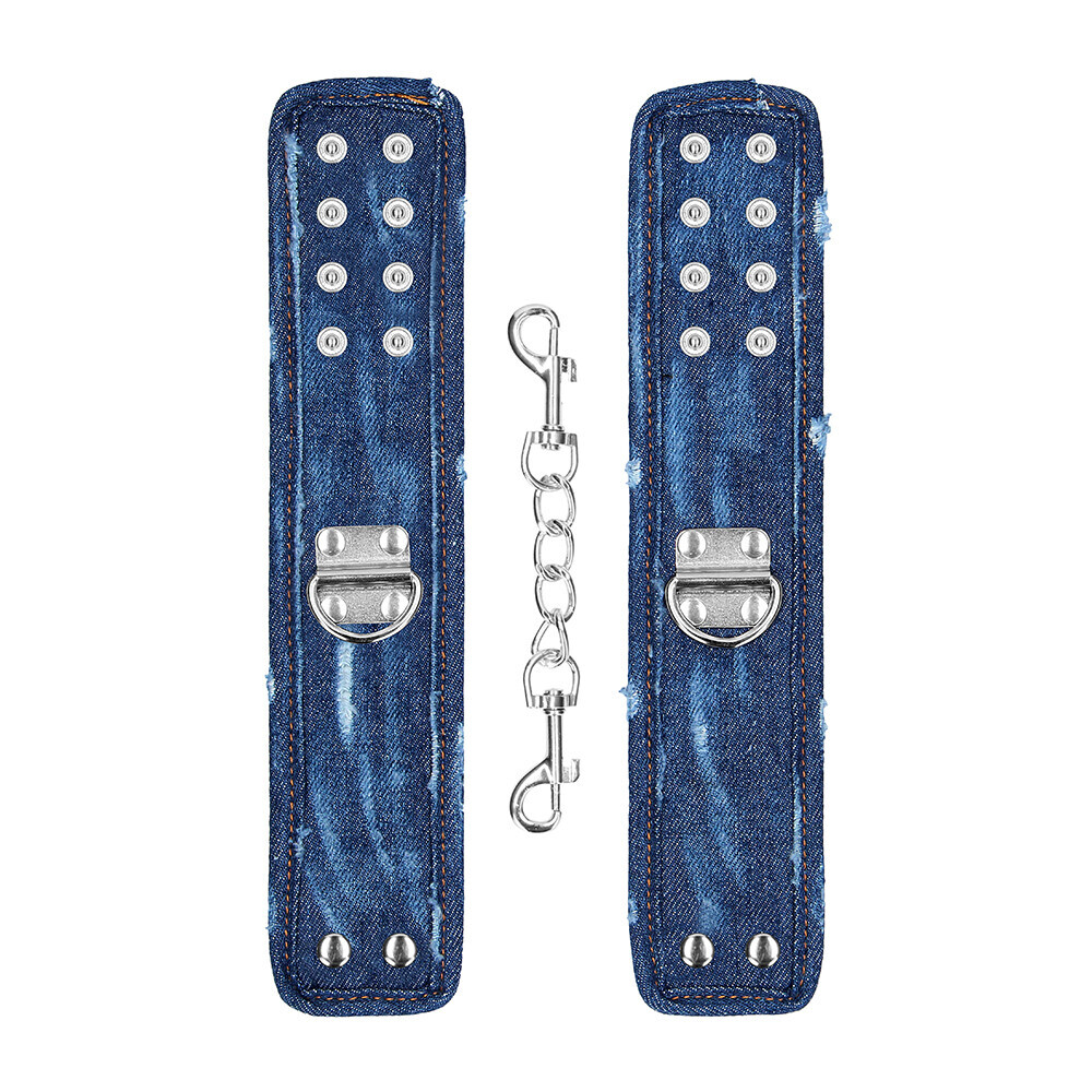 Stand out from the BDSM crowd with these ultra-fashionable OUCH Denim Handcuffs!Manufactured from super-strong and trendy worn denim, they will surely make a statement when you slap them on your partner or disobedient sub. With their non-intimidating presence, these cuffs will be a welcome addition to your BDSM collection.Finished with 2 rows of 4 push buttons, the cuffs can be adjusted to 4 different sizes ranging from the smallest diameter of 4cm, 1.6 inches to the largest of 6.5cm, 2.6 inches, so one size fits most.The sturdy steel D-rings are connected with a stainless-steel chain of 15cm, 5.9 inches. The cuffs have a total length each of 26cm, 10.3 inches and a width of 5.5cm, 2.2 inches.